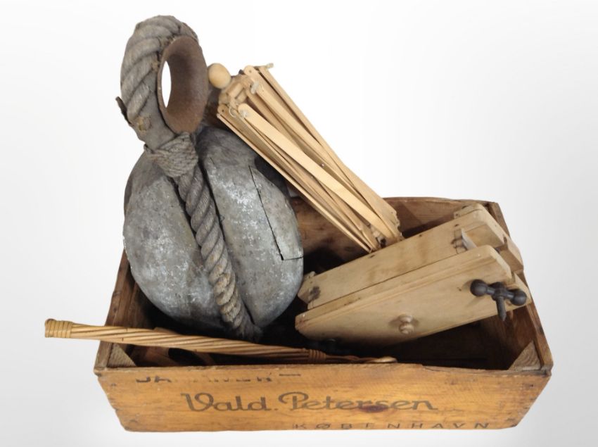 A vintage Danish pine crate containing a 19th century ship's pulley, carpet beater and other wooden items