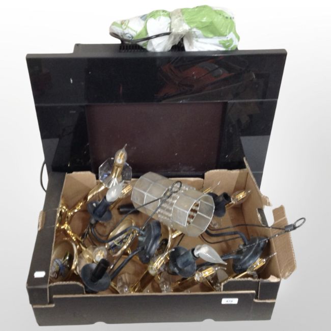 A contemporary electric fire and group of light fixtures