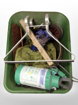 A wheelbarrow containing tools, garden sprayer, sieve, vice, together with a large crowbar, pickaxe, sledgehammer, etc.