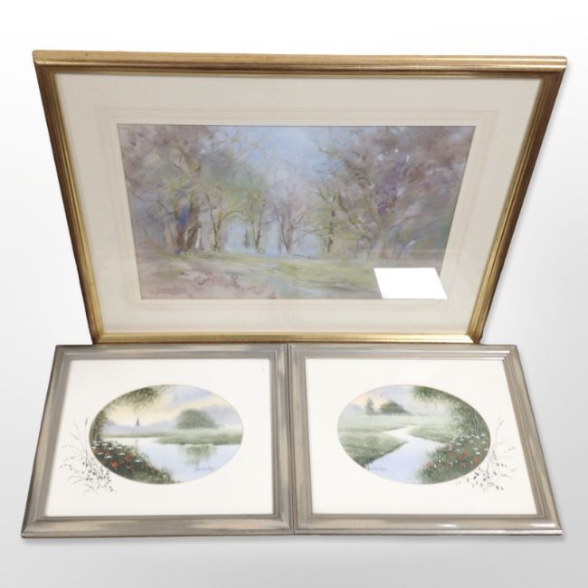 Joyce Gray : Northumbrian Bluebell Wood, pastel, 33cm x 50cm, together with a pair of Paul Purday watercolours.