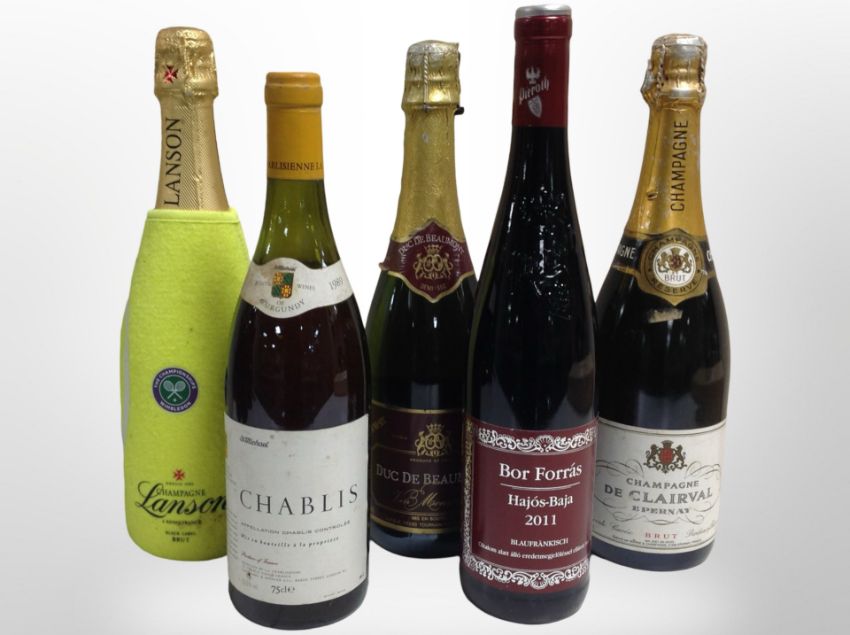 Five bottles of alcohol to include St Michael Chablis, Duc de Beaumont, Bor Forras, etc.