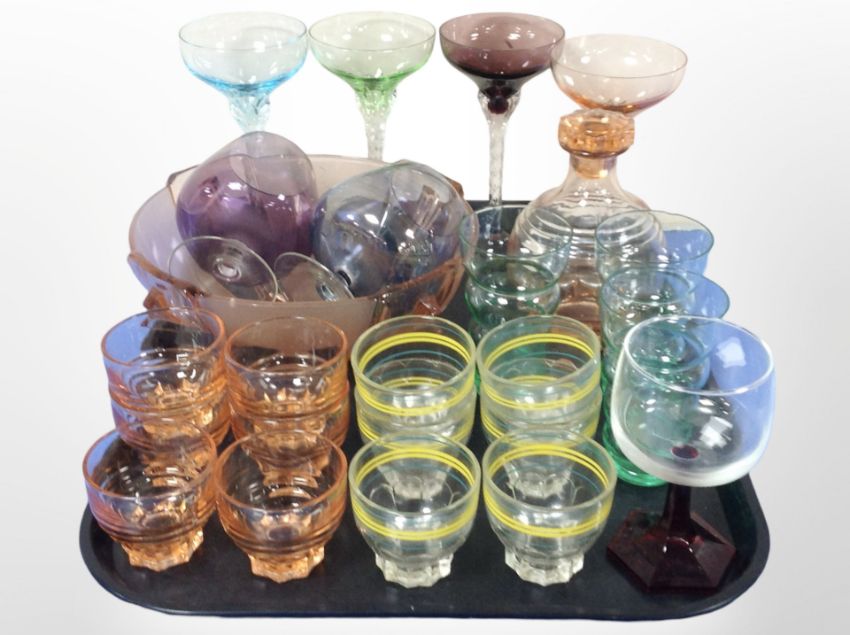 A group of coloured glass drinking vessels, bowls, decanter, etc.