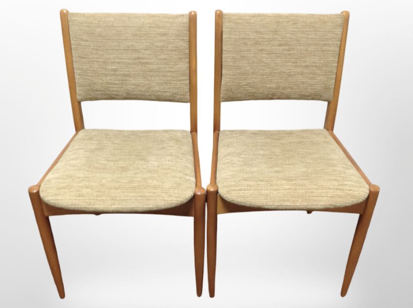 A 20th-century teak circular extending dining table, diameter 122cm (unextended), together with a set of four chairs in oatmeal fabric.