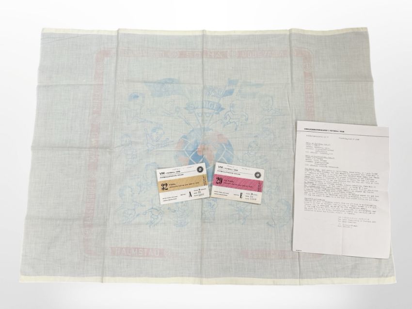 A pair of tickets for the "Pele" 1958 World cup semi-final and final in Sweden, won by Brazil, also included is a silk cloth showing the various teams and an official press release given to journalists.