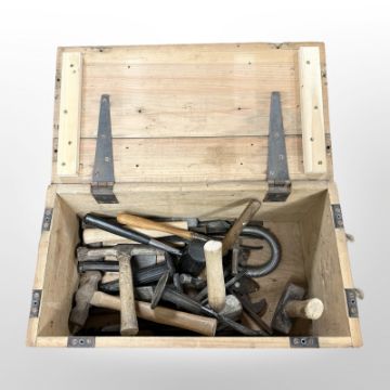 A vintage pine lidded crate containing assorted mallets and hammers, chisels, etc.