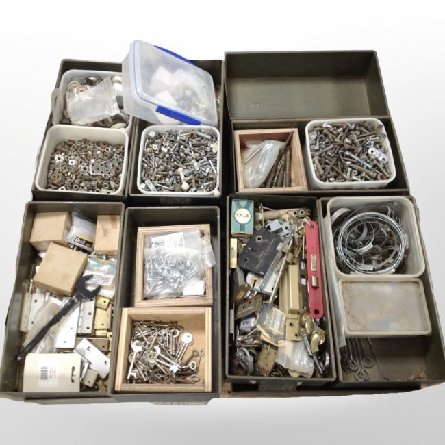 Several enamelled metal trays and boxed containing assorted workshop hardware, nuts, bolts, door furniture, keys, etc.