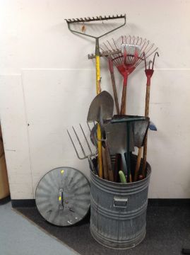 A galvanised bin containing assorted garden tools.