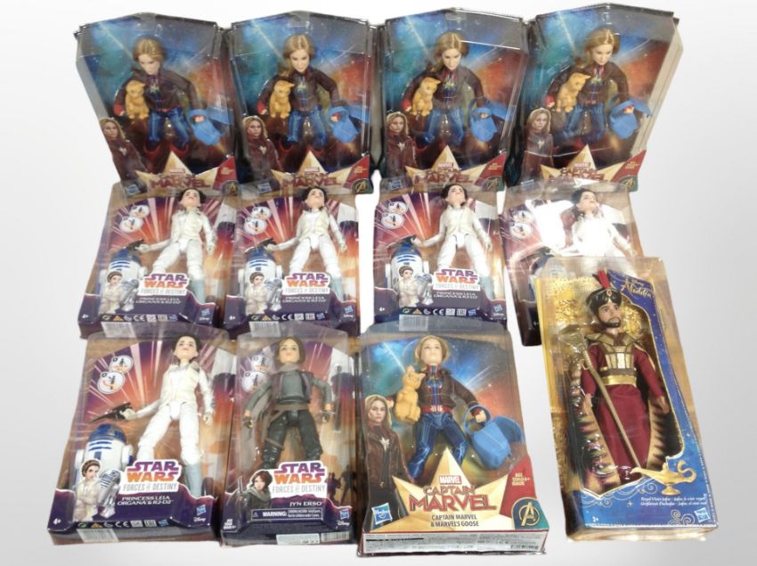 12 Hasbro Figurines including Star Wars, Captain Marvel, Disney Aladdin, etc., boxed.