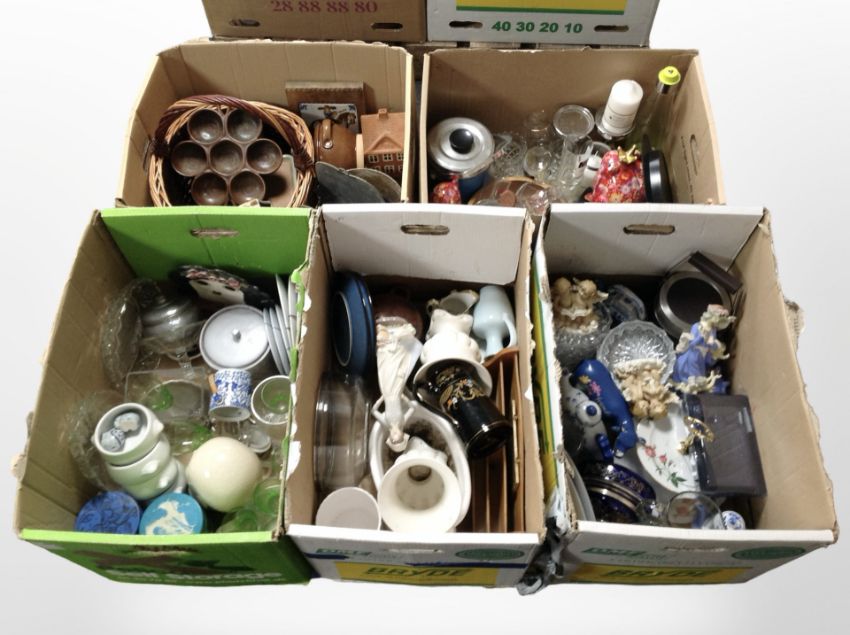 A large quantity of 20th century ceramics, glass and wooden items, wicker basket, etc (five boxes)