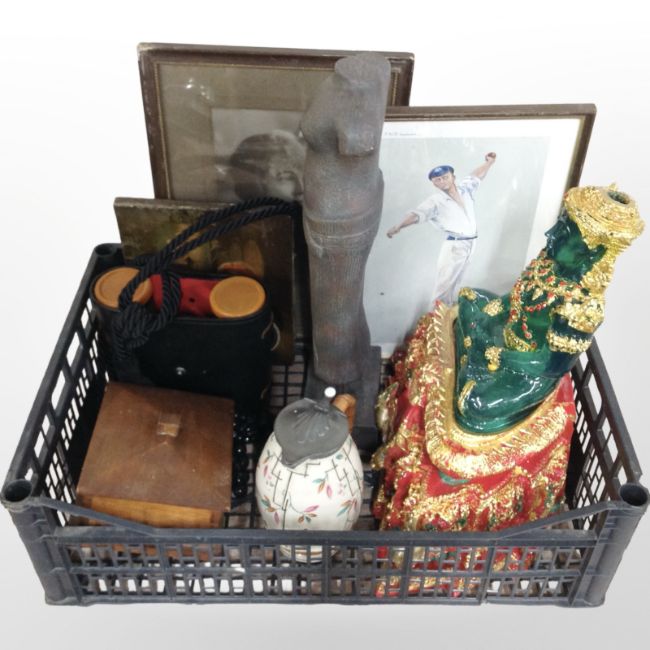 A group of ornaments and glass ware, figure of Buddha, decanters, chess set, pair of binoculars, antiquarian pictures, etc. (2 boxes)