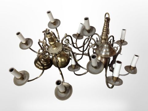 Two brass six-sconce pendant light fittings, wired for electricity, diameter 57cm.