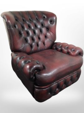 An oxblood buttoned leather Chesterfield armchair, width 98cm.