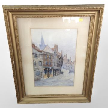 J A Stephenson (19th century) : Figures on a cobbled street, watercolour, 45cm x 29cm, dated 1888.