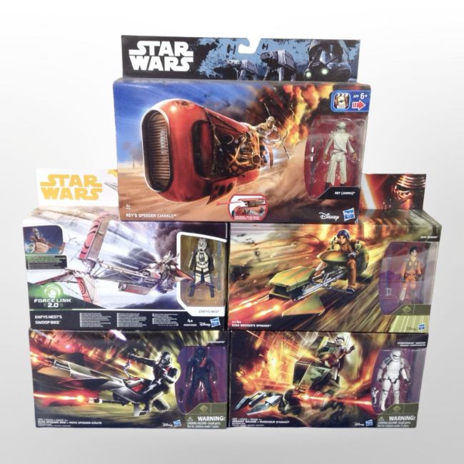 Five Hasbro Disney Star Wars figurines including Rey's Speeder (Jakku), Assault Walker, etc., boxed.