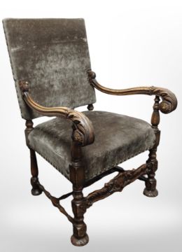 A continental heavily carved oak armchair in brass studded upholstery, width 66cm.