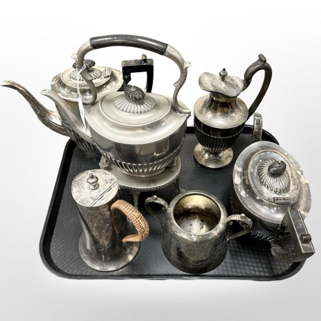 A group of antique and later silver-plated items including spirit kettle on stand, teapot, hot water jug, etc.