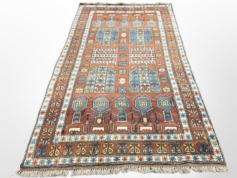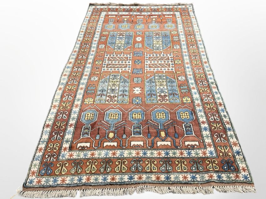 A Konya rug, Central Anatolia, the central field of geometric devices against a coral ground dividing the duck egg blue anthropomorphic motifs to each end, enclosed by coral and ivory geometric borders, 276cm by 167cm