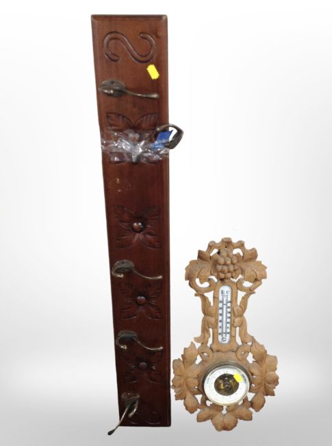 A five-hook coat rack, together with a heavily carved oak barometer.