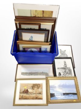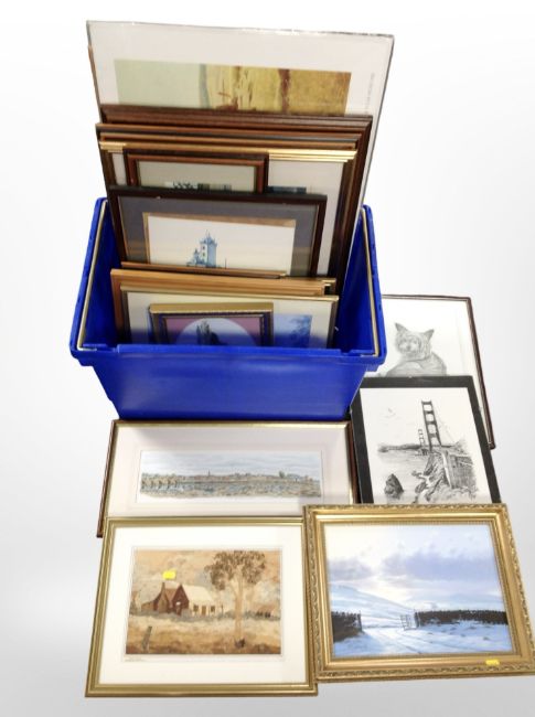 A group of contemporary pictures and prints, gilt-framed oils, needlework pictures, etc. (1 box)