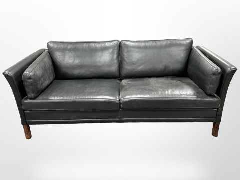 A 20th-century Danish black leather three-seater settee, length 188cm x depth 78cm x height 66cm.
