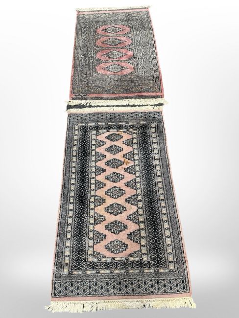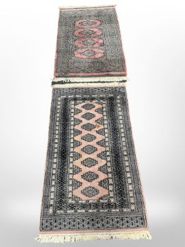 Two Lahore Bokhara rugs on pink ground, largest 141cm x 79cm, and signed to one end.