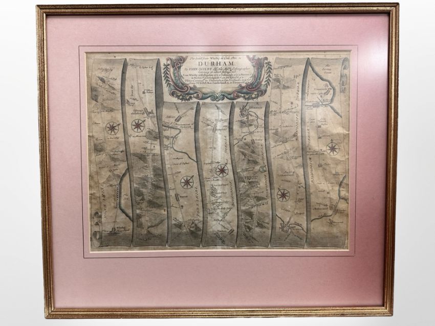 John Ogilby (Scottish, 1600-1676): 'The Roads from Whitby in County Ebor to Durham', engraved strip map with hand colouring, published 1673 or 1698, 34.5cm by 45.5cm, framed and glazed.