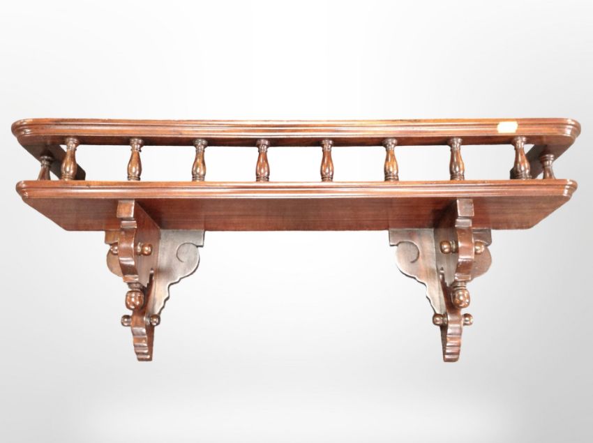A reproduction mahogany galleried wall shelf, width 79cm.