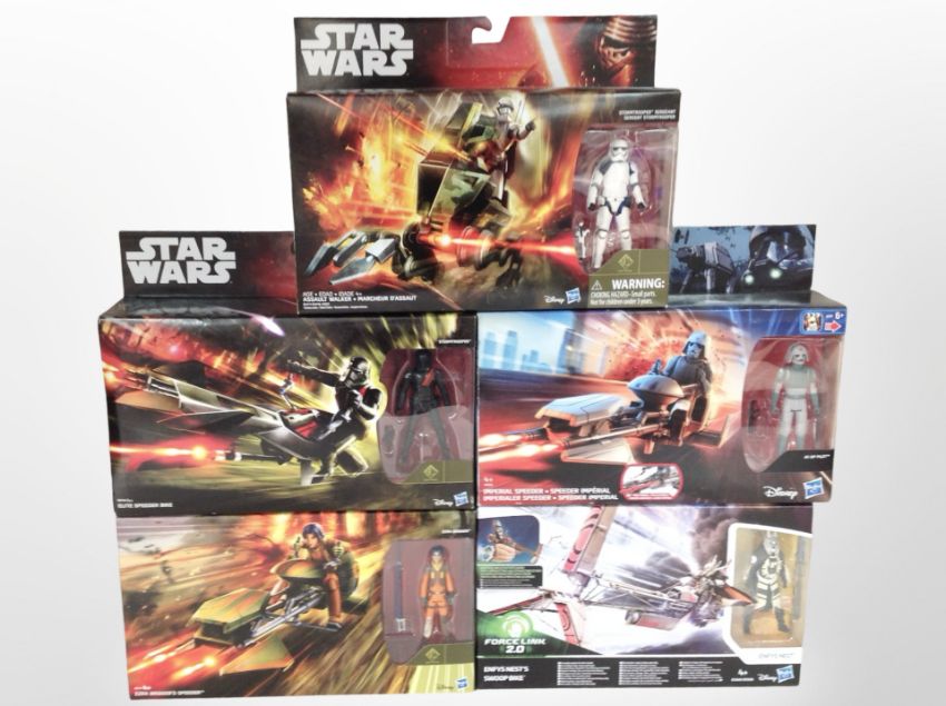 Five Hasbro Disney Star Wars figures including Assault Walker, Elite Speeder Bike, etc., boxed.