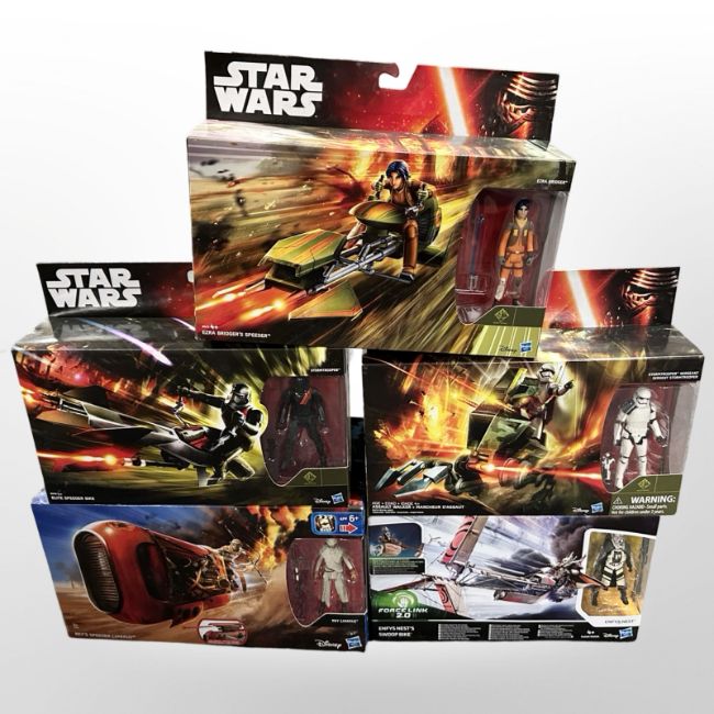 Five Hasbro Disney Star Wars figurines including Ezra Bridger's Speeder, Assault Walker, etc., boxed.
