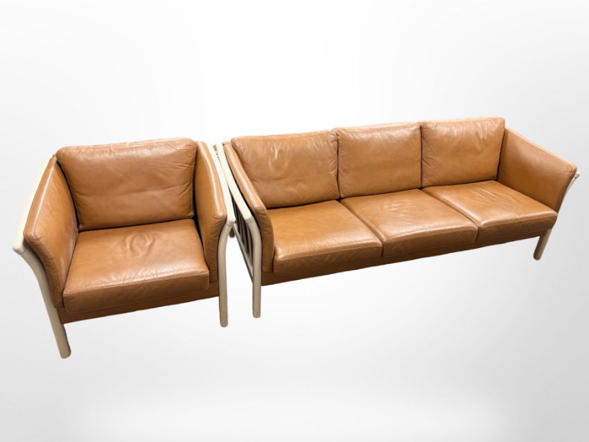 A 20th-century Danish tan leather three-seater settee with matching armchair, settee length 203cm x depth 77cm x height 71cm.