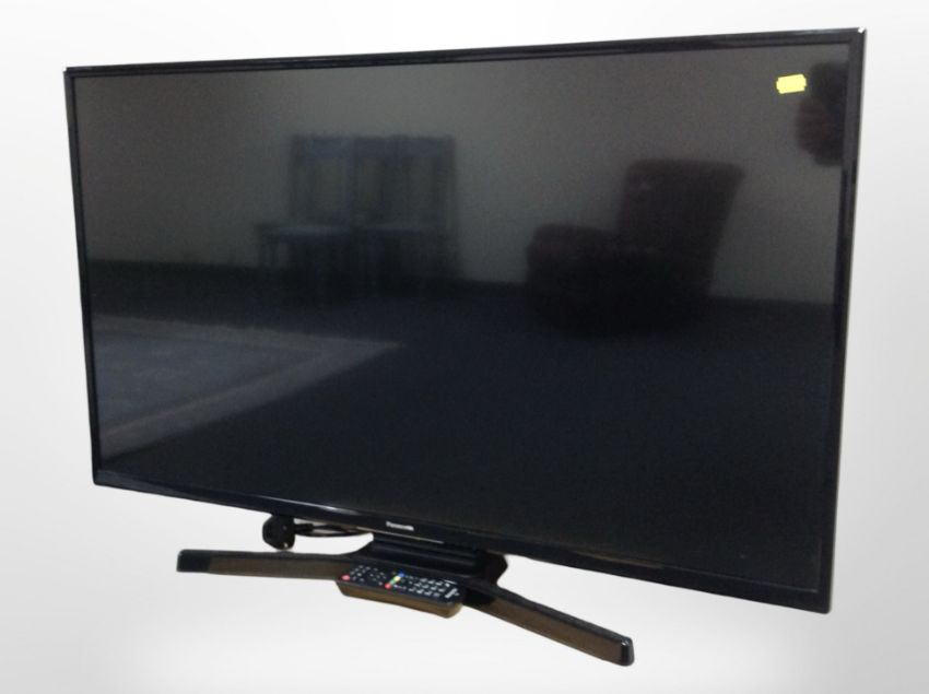 A Panasonic 43-inch LCD TV, with lead and remote.