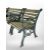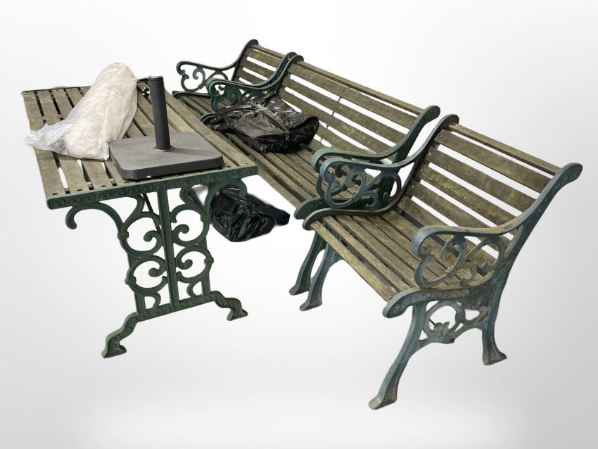 A painted cast-iron and teak garden patio set comprising of rectangular table, double bench, two chairs, parasol with base, and three cushions.