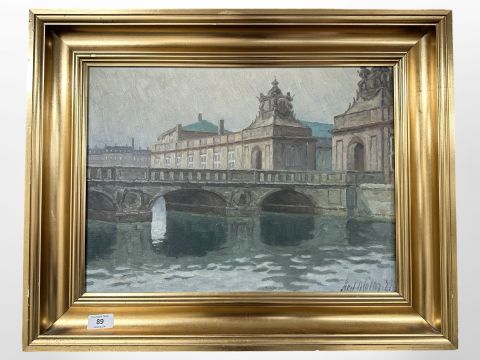Axel Holm : Buildings by a bridge, oil on canvas, 47cm x 34cm.