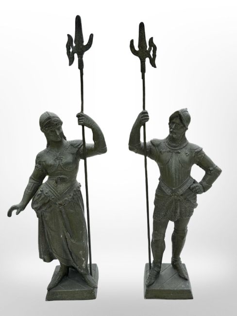 A pair of late-19th century French patinated spelter figures holding halberds, height 32cm.