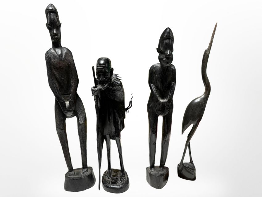 Four African wood/horn carvings, tallest 37cm