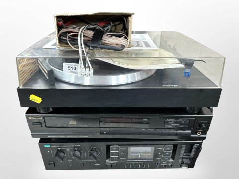 A Sherwood compact disc player CD-3030R, a Sansui synthesizer receiver R-610L, and a Rotel RP-830 belt-drive stereo turntable.
