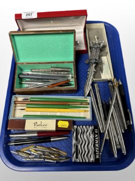 A collection of fountain and ballpoint pens and other writing utensils, letter knives, etc.