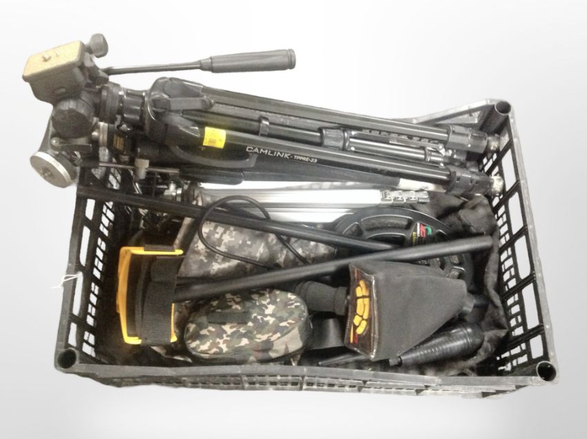 A quantity of camera tripods, Garrett metal detector, etc. (1 box)