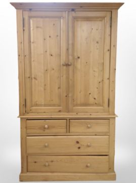 A contemporary pine double-door wardrobe fitted four drawers beneath, 112cm wide x 58cm deep x 192cm high.