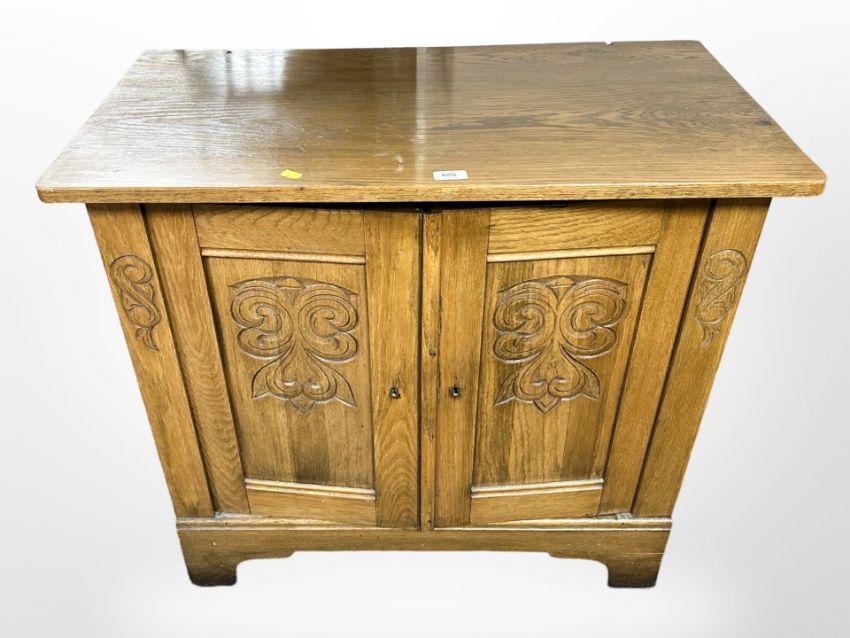A 20th-century carved-oak double-door cabinet, 89cm wide x 45cm deep x 83cm high.