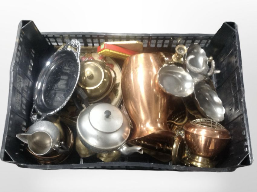 A quantity of metal wares, brass and copper ornaments, candlesticks, etc. (1 box)