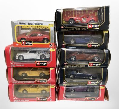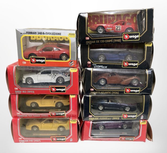 Nine Burago 1/24 and 1/25 scale die-cast vehicles.