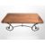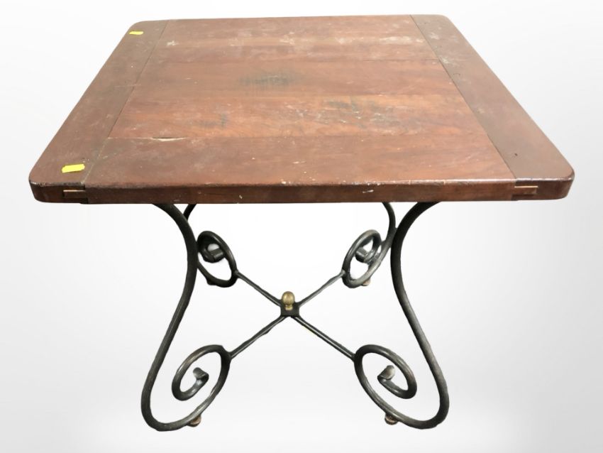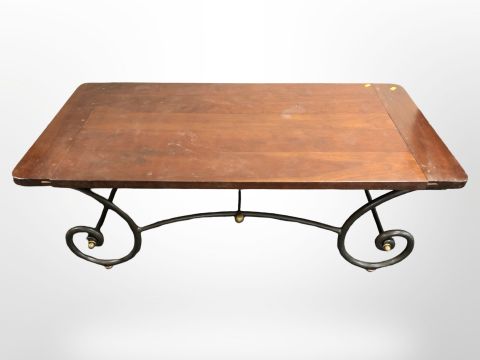 A contemporary coffee table on wrought metal stand, length 122 cm and a matching square lamp table