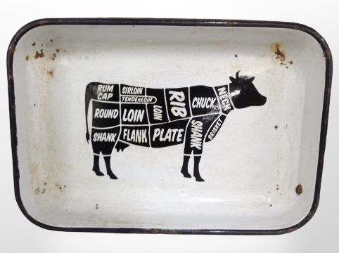 A butchers-style enamelled metal tray with later decoration, width 42cm.
