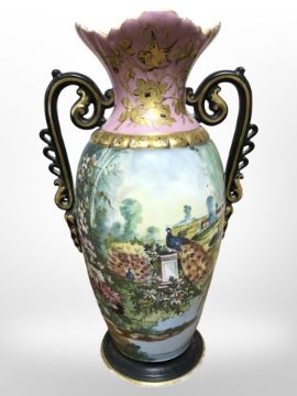 An early-20th century continental porcelain twin-handled vase, hand painted with peacocks, height 46cm.