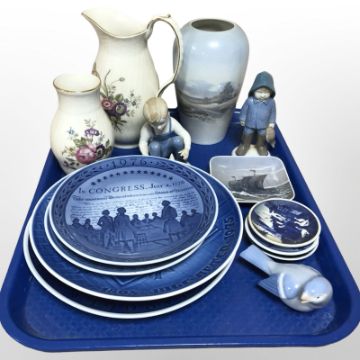 A Royal Copenhagen porcelain jug and similar vase, another vase on blue ground, collector's plates and figures, etc.