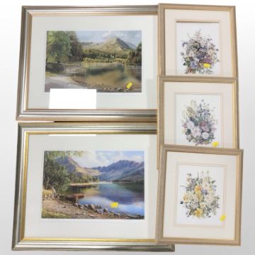 After Paul Harvey : Evening Stroll, limited edition colour print, signed in pencil and numbered 190 of 350, 25cm x 38cm, together with a further print by the same artists and three botanical prints.