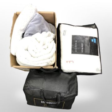 A Dorma king size quilt, a further hotel suite, 200cm x 200cm quilt, both in bags, further box of similar items.