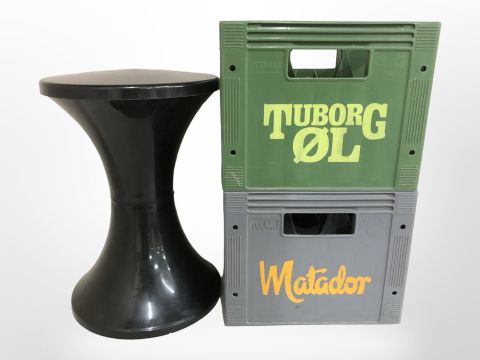 Two plastic bottle crates, and a late-20th century Scandinavian plastic hourglass-shaped stool.