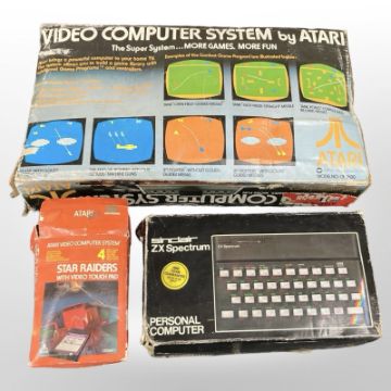 An Itari video computer system, a further Itari Star Raiders with video touch pad, and a Sinclair ZX Spectrum personal computer, all in boxes (packaging as found).